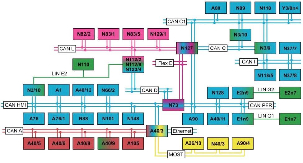 CAN A。车载智能信息系统 (CAN);CAN C. 发动机控制器区域网络 (CAN);CAN C1. 传动系统控制器区域网络 (CAN);CAN D. 诊断控制器区域网络(CAN);CAN HMI. 用户界面控制器区域网络 (CAN);CAN I. 传动系传感器控制器区域网络 (CAN);CAN L. 混合动力控制器区域网络 (CAN);CAN PER. 外围设备控制器区域网络 (CAN);Ethernet. 以太网;Flex E. 底盘 FlexRay;LIN E2. 座椅承载识别区域互联网 (LIN);LIN G1. 左侧大灯局域互联网 (LIN);G2. 右侧大灯局域互联网 (LIN);MOST. 多媒体传输系统。