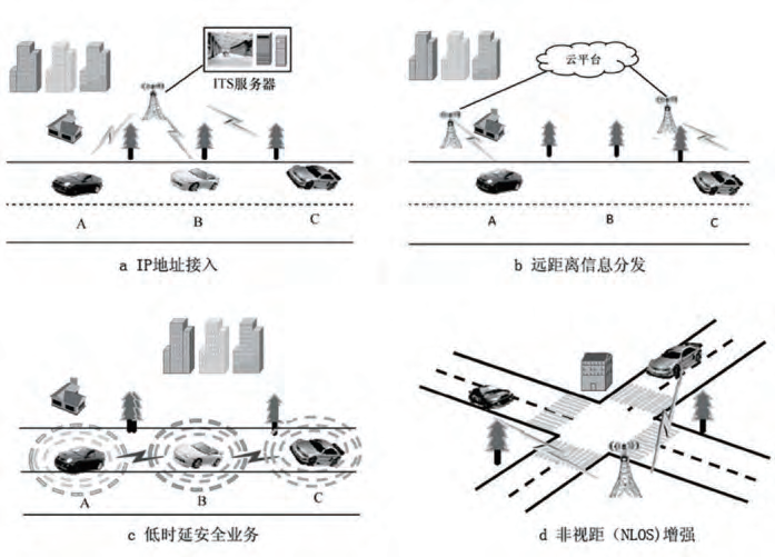 图10(a)中,车辆通过基站或路侧单元获得与远端ITS(智能交通系统)服务器的IP地址接入;图(b)中,车辆通过不同的基站或路侧单元,进而通过云平台,获得分发的远距离车辆的信息;图(c)中,车辆间直接交互与道路安全相关的低时延安全业务信息;图(d)为非视距(notlineofsight,NLOS)场景,车辆在十字路口由于建筑物的遮挡不能直接交互低时延安全业务,此时可以通过基站或路侧设备的转发,获得车辆间的道路安全信息。在上述场景中,图(c)可采用LTE-V-direct模式进行通信,其他场景可采用LTE-V-cell模式进行通信。