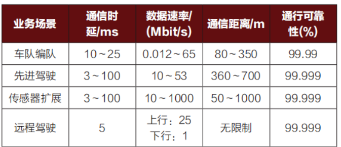驾驶:远程驾驶使远程司机或车联网应用服务器遥控车辆的行驶,适应于车主不能自己驾车或远程车辆处于危险环境中等特殊场景。高可靠性和低延迟通信是远程驾驶的主要要求。5GV2X业务场景对通信的需求,具体如表1所示。