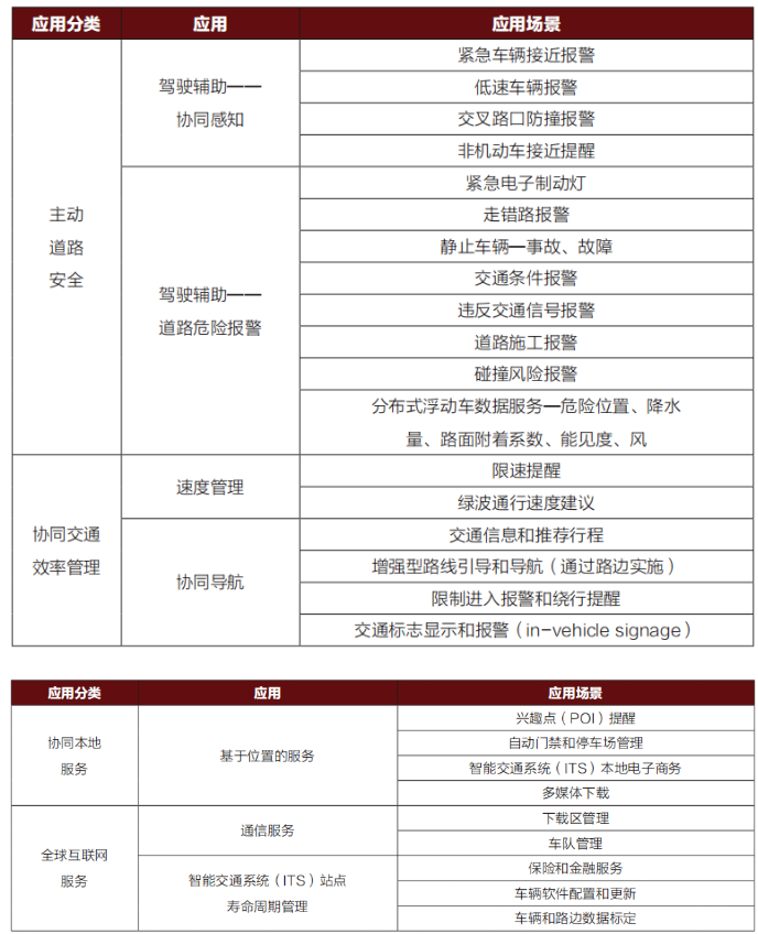 先进驾驶:先进驾驶用于支持半自动或全自动驾驶。每个车辆把通过自身传感器获得的感知数据以及自身的驾驶意图分享给周围车辆,从而支持多个车辆之间同步和协调其行驶轨迹。