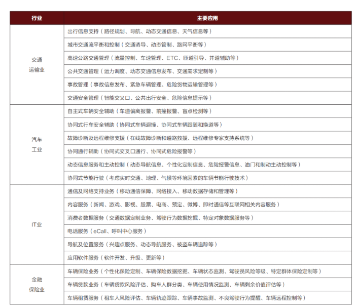 表3反映了车联网在交通运输、汽车、IT、金融保险等几个领域的主要应用,可以看出,车联网对提高行业效能,深耕服务品质,推动建立便捷、安全、环境友好型社会,有着重要意义。