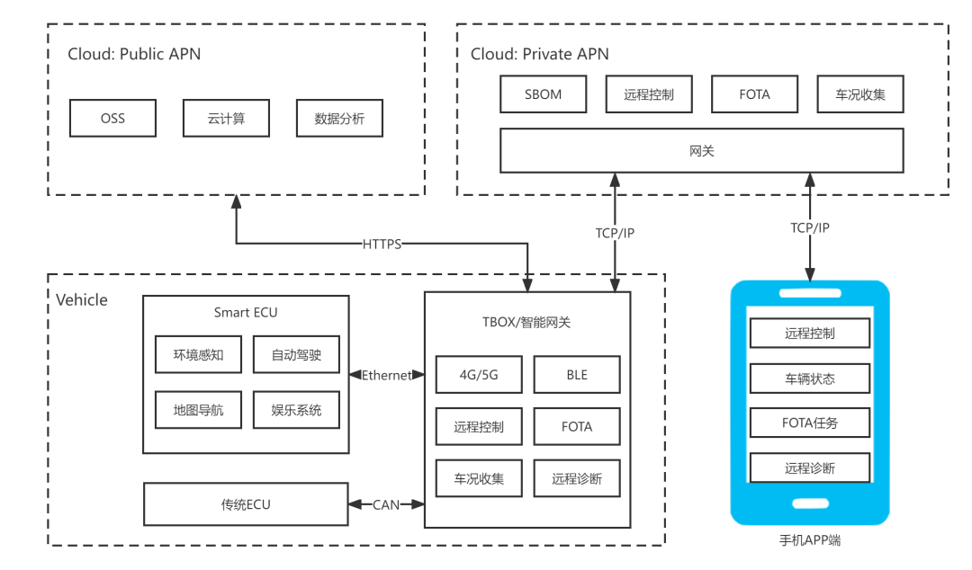车载终端以内置4G/5G通信模块的TBOX/智能网关为主。对外通过远程通信技术与云服务平台进行通信,对内通过CAN/LIN/车载以太网与车内其他ECU进行通信。从而提供行车数据采集、远程查询和控制、远程诊断、远程升级等服务。