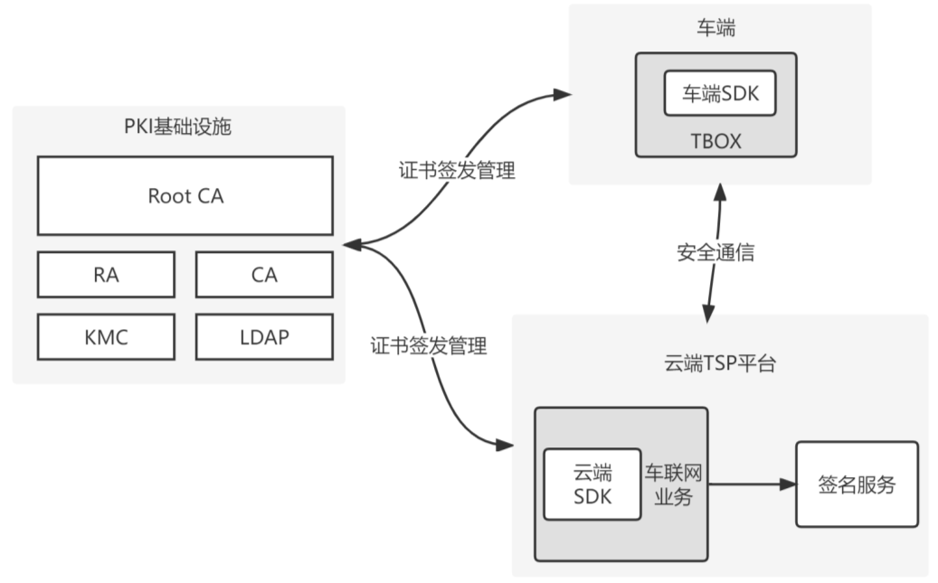 通过对上述风险的分析,结合车联网业务流程涉及车云两端的频繁交互,迫切需要为参与车联网业务的核心实体对象(云服务平台、车载终端等)赋予高强度的身份标识,保证实体对象的唯一性,同时基于各实体对象的身份标识,实现车载终端接入车联网服务平台的双向高强度身份校验。