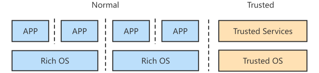 操作系统和应用运行在NWS,TEE运行在SWS。通常一个 TEE包括多个由轻量级内核托管的可信服务,提供诸如密钥管理之类的功能,并为开发人员提供相应的API。