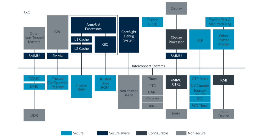 一个完整的SoC由ARM内核、系统总线、片上RAM、片上ROM以及其他外围设备组件构成。对于ARM内核的控制器,需要支持TrustZone,同时配合相应的组件,才能实现整个系统芯片达到硬件级别的保护和隔离措施。下图是一个支持TrustZone的SoC的硬件框图。