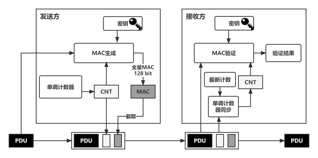 SecOC主要基于两种手段来实现数据的真实性和完整性的校验,分别是基于MAC的身份验证和基于新鲜度的防重放攻击。首先MAC是保障信息完整性和认证的密码学方法之一,SecOC协议中MAC消息认证码的作用是验证报文数据的真实性,然而保证报文的机密性还需要进行额外的安全措施。