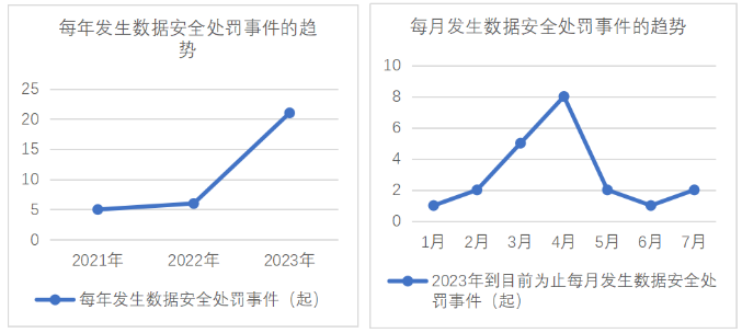 通过对近两年数据安全事件发生的时间进行汇总,2021年共发生5起,2022年共发生6起,2023年到目前为止已发生21起。相比前两年,2023年呈爆发式增长。并且2023年每个月都有处罚案例,在3月和4月分别达到5起和8起。说明随着《数据安全法》实施和相关配套体系的完善,相关部门正加大执法力度和频度。
