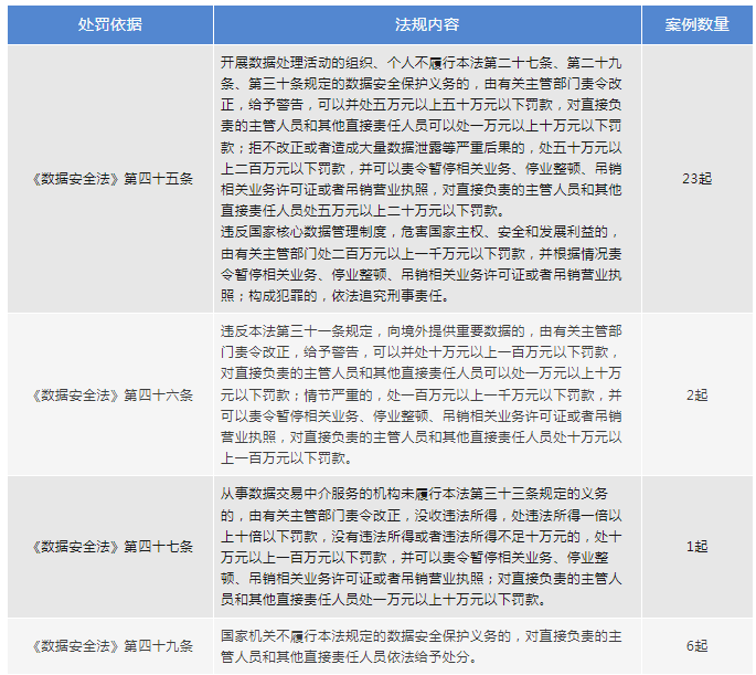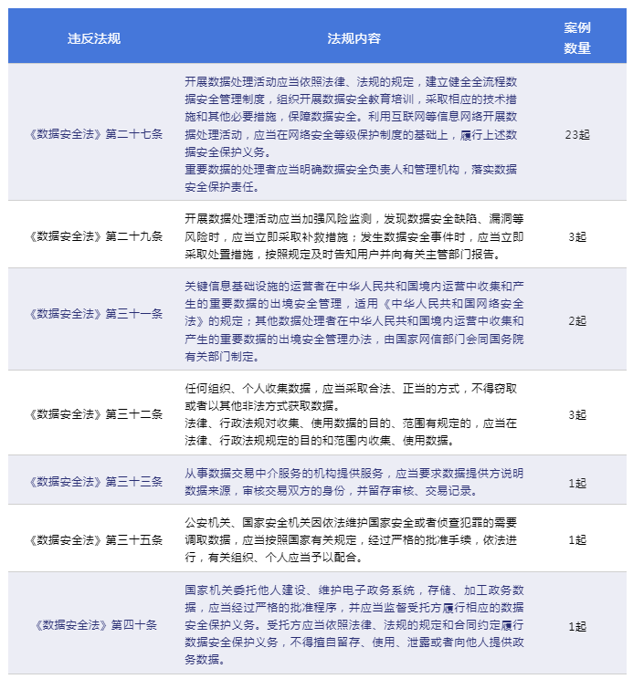 通过对所有数据安全法处罚案例的总结,处罚的法规条目主要有《数据安全法》第四十五条、四十六条、四十七条、四十九条。