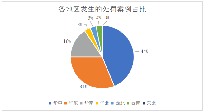 从区域来看,处罚案例最多的是华中地区,共14例,占比44%;华东地区共10例,占比31%;华南地区共5例,占比16%;华北、西北及西南地区各1例,占比皆为3%;而东北地区未发生因数据安全导致的处罚事件。