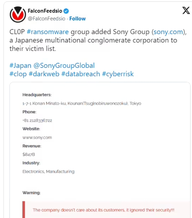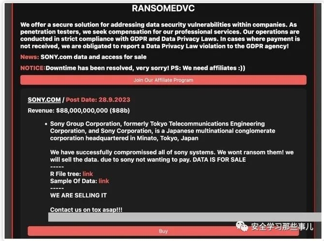 同时该组织还表示,由于索尼公司不愿意配合谈判并按要求支付赎金,因此他们将公开售卖这些“数据和访问权限”。