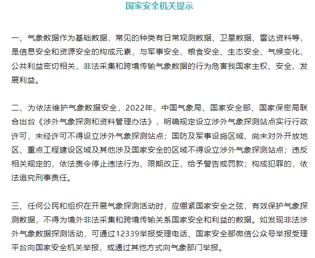 据国家安全部10月31日消息,国家安全机关会同有关部门开展涉外气象探测专项治理。调查境外气象设备代理商10余家,检查涉外气象站点3000余个,发现数百个非法涉外气象探测站点实时向境外传输气象数据,广泛分布在全国20多个省份,对我国家安全造成风险隐患。