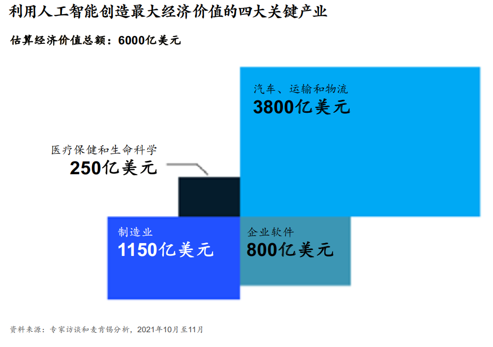 在6000亿美元的机遇中,半数以上将来自汽车、交通运输和物流行业(约64%);19%来自制造业;13%来自企业软件;还有4%来自医疗保健和生命科学。