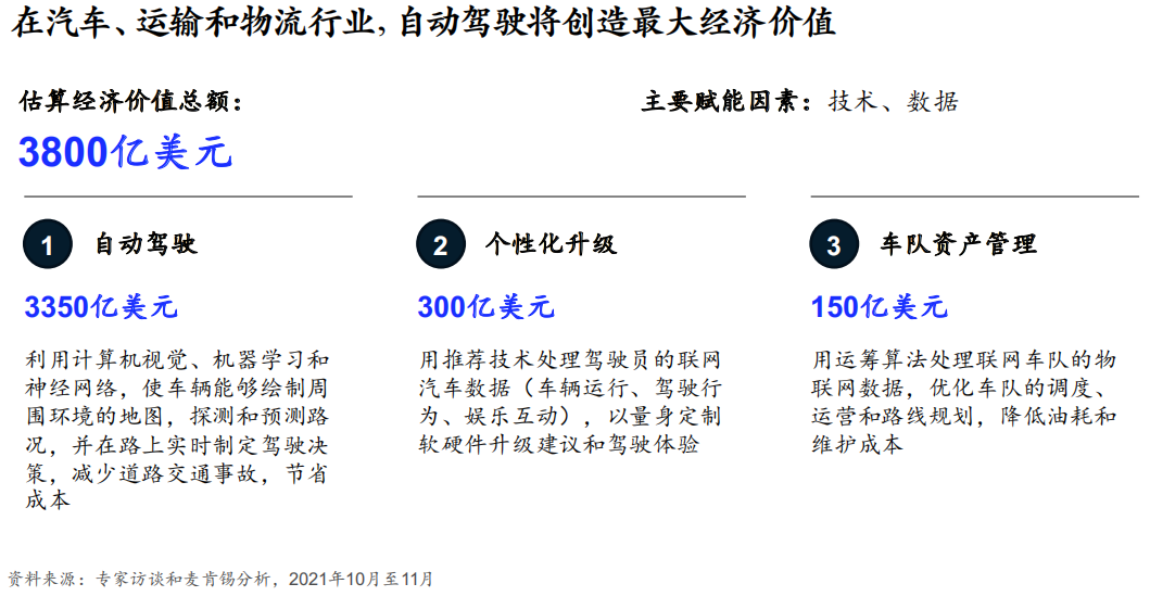 麦肯锡认为,人工智能对汽车行业的潜在影响最大,有望创造超过3800亿美元的经济价值。主要来自以下三个领域:自动驾驶或无人驾驶汽车、为车主提供个性化体验、车队资产管理。