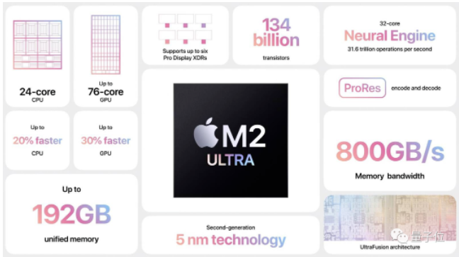 M2 Ultra芯片带有24核CPU、76核GPU、32核神经引擎,并支持高达192GB的统一内存,属实为苹果史上最强的“芯片怪兽”。