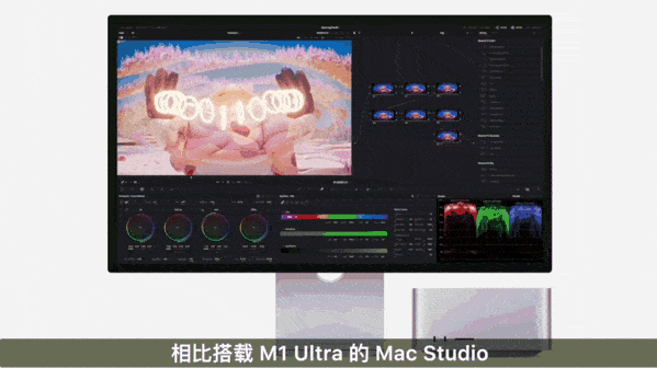 搭载它的Mac Studio,相比配备M1 Ultra的前代产品,渲染速度可提高3倍,视频处理速度快50%。