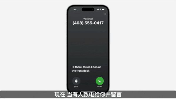 另外,在接听电话时,iPhone提供了Live Voicemail的功能。就是说,有人打来电话并留言时,端侧AI可以直接帮你把留言信息转成文字,方便你决定是否接听这通电话。