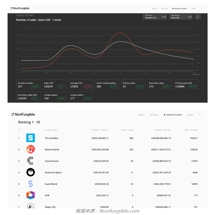 Nonfungible.com的数据显示,过去7天,Metaverse领域的交易额近200万美元,占NFT市场总交易额的2.8%(NFT市场在写稿时过去7天交易量为7100万美元)。当中Decentraland交易量为250,交易额超200万美元,排名第二;The Sandbox交易量为406.交易额超343美元,排名第一。