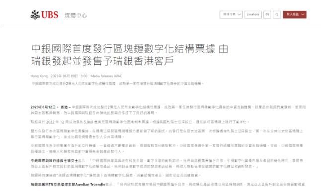 6月12日,瑞银集团(UBS),即瑞士银行官网发布消息显示,中国银行集团旗下境外投资银行机构中银国际(BOCI)成功发行了由瑞银发起并向其香港客户配售的数字化结构性票据,总价值2亿元人民币,中银国际成为首家在香港发行代币化证券、在境外的发行结构性票据的中资金融机构,以此开启了香港区块链数字化证券的新的里程碑。