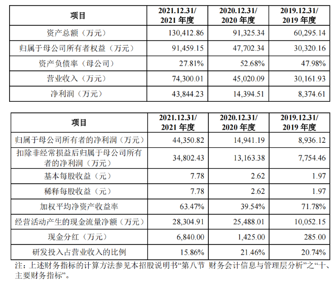 报告期内,企业营业收入与利润规模快速增长,经营业绩保持稳定向好趋势。2019 至 2021 年度企业营业收入分别为 3.02亿元、4.5亿元和 7.43亿万元,营业收入的年均复合增长率为 56.95%。企业2019年净利润为8573万元、2020年尾1.44亿元、2021年净利润超过4亿,报告期内扣除非经常性损益后归属于母公司股东的净利润年均复合增长率高达111.85%。