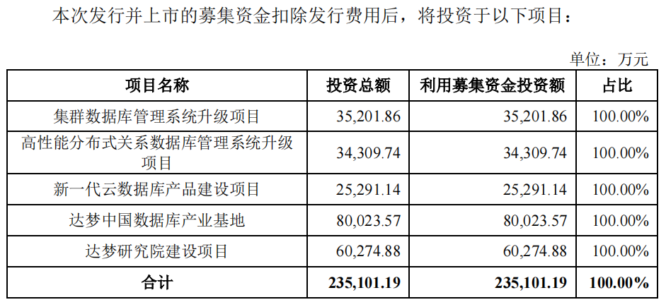 招股书显示,达梦数据本次拟募集资金23.51亿,将用于集群数据库管理系统升级项目、高性能分布式关系数据库管理系统升级项目、新一代云数据库产品建设项目及达梦研究院建设项目。