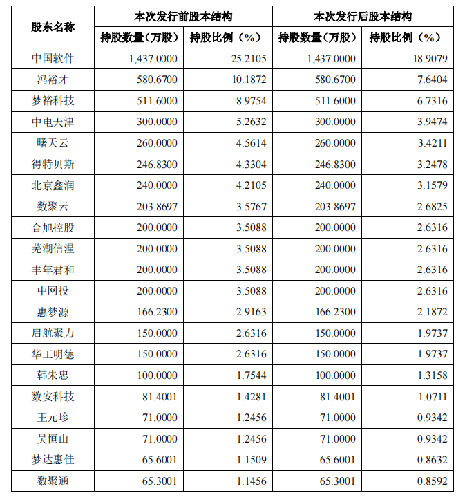 IPO后,中国软件持股为18.9079%,冯裕才直接持股为7.6404%,梦裕科技持股为6.7316%,中电天津持股为3.9474%,曙天云持股为3.4211%,得特贝斯持股为3.2478%,北京鑫润持股为3.1579%,数聚云持股为2.6825%;