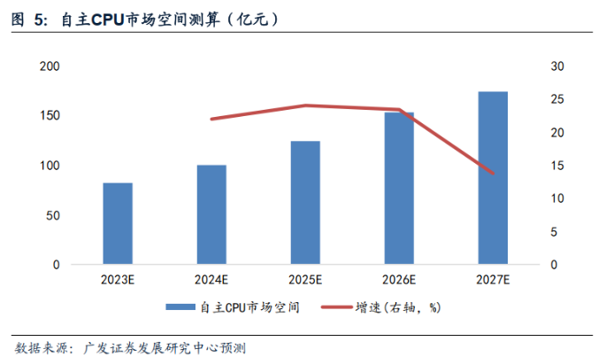 CPU:预计23-27年自主CPU市场空间为82亿、100亿、124亿、153亿、174亿元。美国BIS出口禁令对自主CPU厂商的生产能力影响尚待评估,未来自主CPU格局仍有待跟踪,可预见的中短期内有相当挑战。