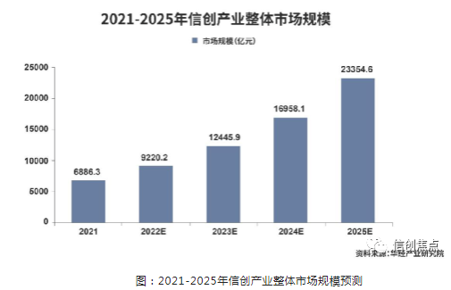 信创产业在2019年进入大众视野后,2020年至2022年迅速迈入“信创黄金三年”。2020年,经过党政信创的规模化推广和行业信创的大规模试点,产业发展进一步提速,信创产业进入元年;2021年,信创产业案例应用大量落地;2022年,信创产业开始规模化、行业化推广。面向2023年,信创产业的规模正不断扩大,行业信创市场叠加央国企信创将释放出前所未有的活力。据相关数据显示,2021年信创产业规模达6886.3亿元,近五年复合增长率为35.7%,预计2025年有望突破2万亿。