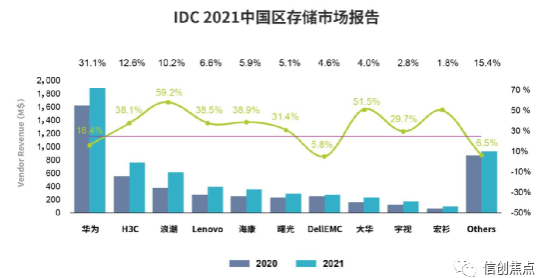 2021年中国区企业级存储市场厂商份额情况如下图: