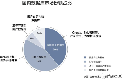 据Gartner报告显示,按收入统计,目前海外商业数据库份额占39%,公有云数据库占比45%,基于开源的国产数据库占6%,纯国产自研内核数据库占比仅有10%。数据显示目前国产自研内核数据库市场份额占比还很低。
