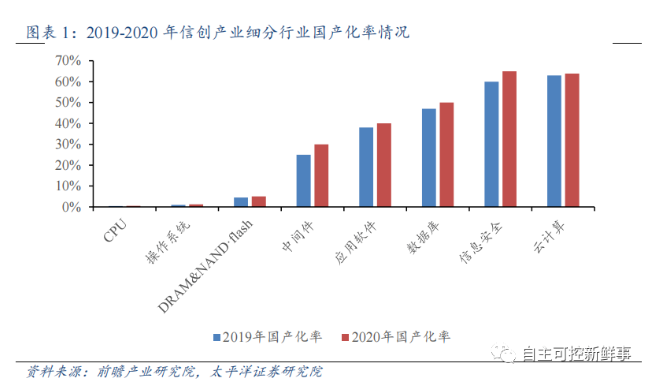 信创不同环节国产化率差异明显,从下往上国产化率呈现总体提升趋势。从信创不同环节来看,由于技术复杂度和进入门槛高,CPU、操作系统等位于IT架构较底层的环节国产渗透率最低,不足5%;越往上走则国产化率越高,根据前瞻产业研究院数据,2020年中间件、应用软件、数据库、信息安全、云计算国产化率分别达到30.0%、40.0%、50.0%、65.0%、63.9%。