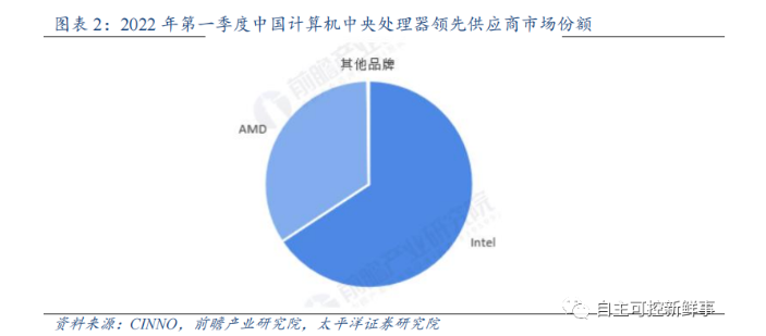 CPU等高端处理器市场几乎完全被国际巨头垄断。从PC/服务器端的CPU芯片方面来看,Intel和AMD占据绝对的市场份额,两家企业出货量占市场份额近乎100%,接近完全垄断。