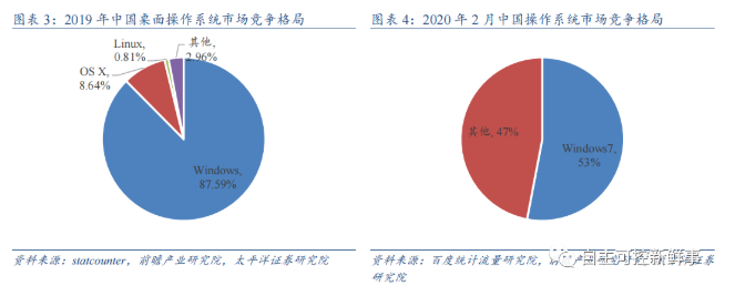 操作系统Windows一家独大,国产操作系统空间大且发展紧迫性高。在桌面操作系统领域,微软凭借强大的生态与预装优势,其Windows系统几乎占据我国操作系统市场,根据Statcounter的统计数据显示,截至2019年12月,Windows系统在我国桌面操作系统份额中高踞88%;其次是苹果公司的OS X系统,市场份额为9%。操作系统整体格局中,根据百度统计流量研究院的数据,截止到2020年2月,Windows7在我国操作系统领域仍占据52.4%的份额,这意味着微软停止Windows7服务,我国将有超过一半的电脑将处于安全无法保障的处境。因此,国内操作系统行业还有很大的提升空间,同时,推出我国由自主研发的操作系统具有重要的战略意义。
