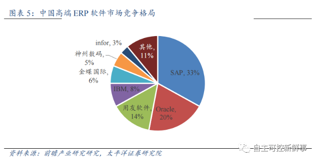 高端ERP市场仍有较大国产替代空间。我国部分领先的ERP企业已经发展较为成熟,尽管整体ERP市场中用友、浪潮、金蝶等占据较大份额,但国内企业主要在国内中小型企业客户群体中占据优势,凭借价格低、操作简单等优势将国外厂商排除在外,而在高端ERP领域还是以国外厂商为主导。SAP和Oracle分别于1995年和1989年进入中国市场,在国产ERP厂商羽翼尚未丰满时抢占了市场先机,填补了当时国内大企业对ERP系统的需求。随着国内ERP企业的不断发展进步,对大企业客户的拓展成效显现,且凭借本土化的优势,有望替代高端ERP市场中的国外厂商份额。
