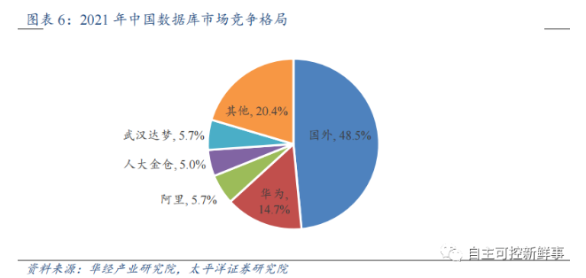 国产化率相对较高的数据库市场仍有将近一半的替代空间。2021年甲骨文、微软、IBM、SAP四家国外大厂在中国本地部署RDBMS市场中合计占据45-50%的市场份额,国产供应商主要包括华为、阿里、达梦、人大金仓,合计占据约30%份额。我国主要数据库企业武汉达梦、人大金仓、南大通用和神舟通用四家均起步于2000年左右,经过20多年的发展渐趋成熟,随着信创的快速推进,仍有望扩大市场份额。