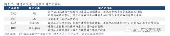 通用型研发设计类软件由海外垄断,国产厂商在垂直领域寻求优势突破。通用型研发设计类软件外资厂商占据主要的市场份额,国内厂商追赶难度较大,研发设计类软件具有跨学科、复杂知识系统的工程化特点,造成行业化难度大、生态构建难的局面。同时由于通用型软件厂商正在以平台化的方式快速发展,国内厂商追赶难度较大。在CAD、EDA、BIM等赛道国产厂商逐渐获得细分垂直领域的国产化突破。