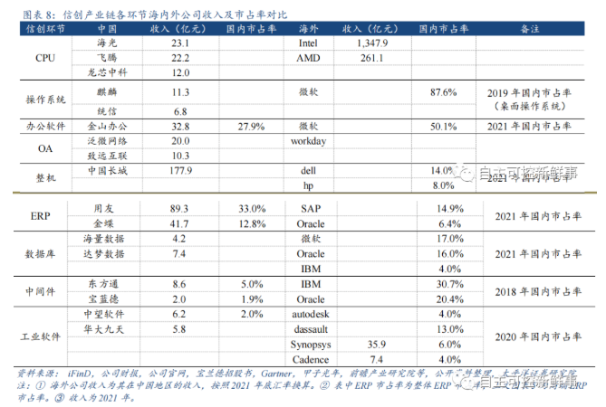 我国信创公司替代空间与成长空间巨大。1)从信创各环节国产化率看,CPU 等高端处理器几乎全部被国际巨头垄断,操作系统 Windows 一家独大,尽管我国 ERP 企业发展较为成熟,但在高端市场仍然不敌 SAP、Oracle 等海外巨头,国产替代空间仍大。2)从产业链各环节海内外公司对比来看,我国信创公司与海外巨头收入体量和在国内的市占率仍然差距较大,随着信创不断推进,国产化进程加快,我国信创公司有望获得长足发展。