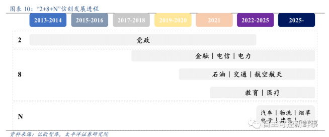 信创招标如火如荼,更大范围普及值得期待。1)今年 6 月以来,不断出现大额招标项目,招标主体包括国家药品监督管理局、银行、教育局、高校等多类机构,我国不少软件公司陆续中标。一方面体现出国产替代步伐加快,各招标单位选择国产厂商的意愿提高;另一方面也侧面反映出我国信创各环节公司自身产品的进步,逐步得到认可。2)自 2013 年开始,党政从公文系统开始替换计划,八大重点行业中金融行业信创首当其冲,推进速度最快,电信紧随其后,之后能源、交通、航空航天、教育医疗等逐步进行政策推进和试点,亿欧预计 N 个行业的信创有望 2023 年左右开始启动。从近期大额中标情况来看,目前还主要集中在金融、政府机构、教育机构等关键领域,随着信创的持续推进,预计将向更多行业拓展。