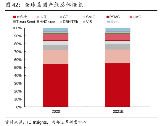 横向对比,除台积电于2021年表示未来3年投资1000亿美金、扩产规模大于中芯国际外,三星美国德州项目计划投资规模在170亿美元,联电在中国台湾的项目规模在30亿美元,格芯未来数年的扩产投入在60亿美元,力积电未来扩产项目规模折合91亿美元(2780 亿新台币)——其他厂商投入均小于中芯国际扩产投入,而中芯国际凭借产能的大举投入,在未来数年的全球份额有望持续攀升。