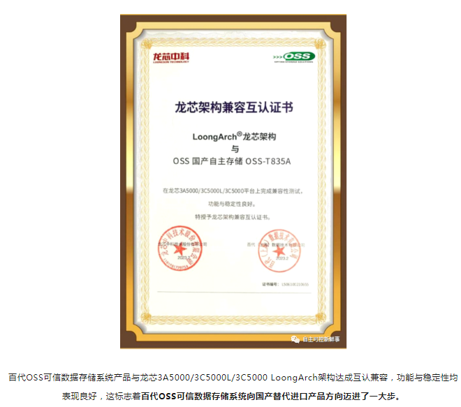 在外有技术垄断,内有研发困难的背景下,百代(上海)数据技术有限公司心怀科技报国情怀,16年来致力于存储领域的前沿技术开发,在2月宣布完成与龙芯架构兼容互认证后,并于近日正式官宣:国内唯一基于龙芯自主架构的存储系统系列产品“百代OSS可信存储系统Opti R5000”正式落地交付。