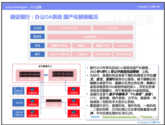 据中国电子/长城的官网案例信息,2022年9月,建设银行已基于”PK“体系实现协同办公系统(0A)、电子邮件系统和企业级云文档系统的全面替换与重构,满足35万名员工一体化协同办公需求[2]。技术全栈信创,包括飞腾CPU、长城服务器、麒麟操作系统、麒麟云、麒麟云桌面、达梦数据库等。