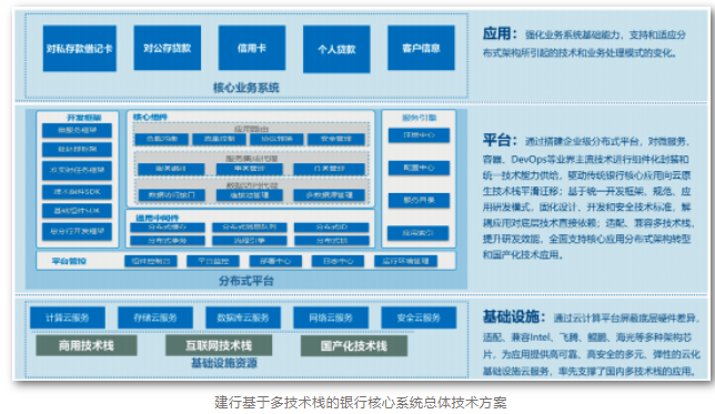 转型后的多技术栈银行核心系统实现多技术栈融合运行、分布式部署、模型化设计开发、全量并行验证、业务连续性保障等技术目标。