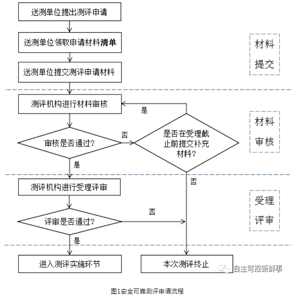 安全可靠测评申请流程分为材料提交、材料审核、受理评审3个阶段。