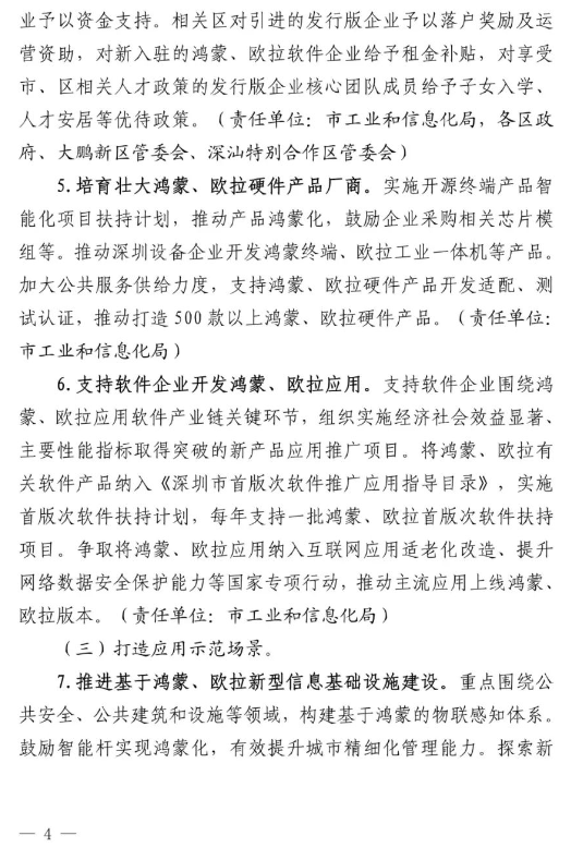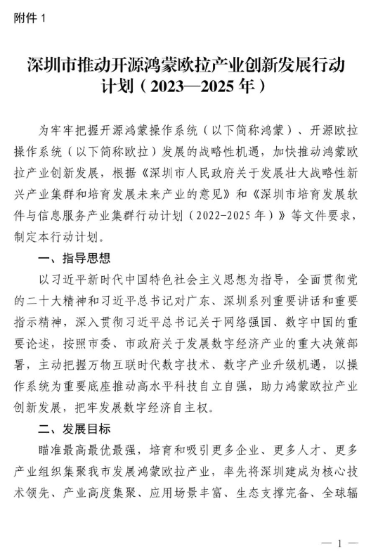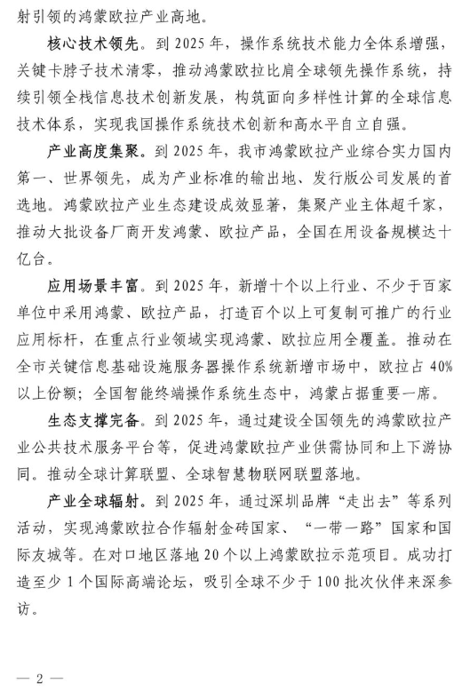 《深圳市推动开源鸿蒙欧拉产业创新发展行动计划(2023-2025年)》:到2025年,操作系统技术能力全体系增强,,推动鸿蒙欧拉比肩全球领先操作系统;到2025年,我市鸿蒙欧拉产业综合实力国内第一、世界领先,全国在用设备规模达十亿台。