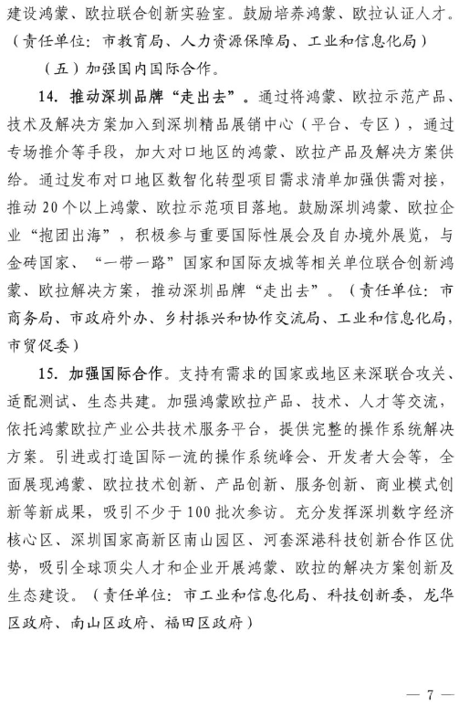 产业全球辐射。到2025年,通过深圳品牌“走出去”等系列活动,实现鸿蒙欧拉合作辐射金砖国家、“一带一路”国家和国际友城等。在对口地区落地20个以上鸿蒙欧拉示范项目。成功打造至少1个国际高端论坛,吸引全球不少于100批次伙伴来深参访。