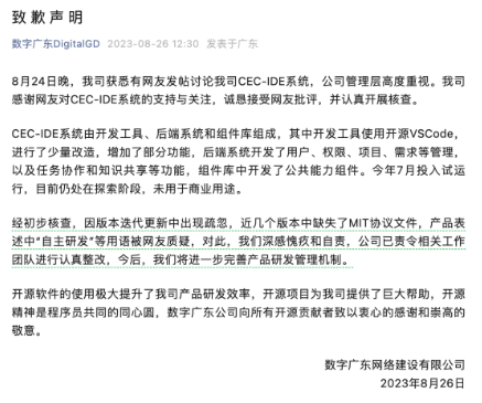 8 月 26 日,“数字广东”正式回应,发布了一则致歉声明。声明内容如下: