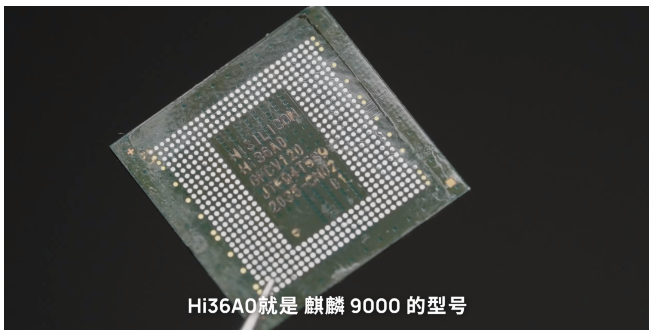由于手机后盖圆弧设计,需要从正面开盖。步步拆解后,压在海力士内存下的组件就是华为芯了,其中第一行丝印写着海思半导体,Hi36A0代表着麒麟9000。