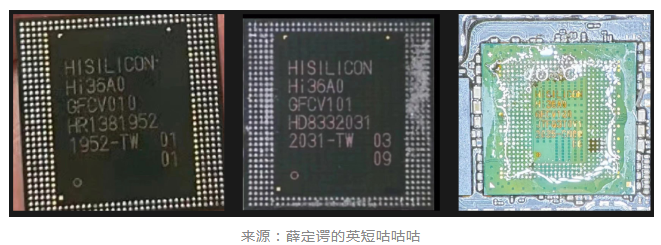 下图中的芯片从左到右分别是,麒麟9000的工程机样片、麒麟9000的量产片和此次Mate60 Pro的麒麟9000s。