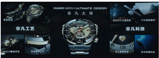 华为首款黄金智能腕表ULTIMATE DESIGN非凡大师,该产品手工镶嵌6段18k金条,手表支持双向北斗卫星消息、百米深潜科技,也是迄今为止业内最贵的智能手表,这一趴还有华仔本人上场安利。