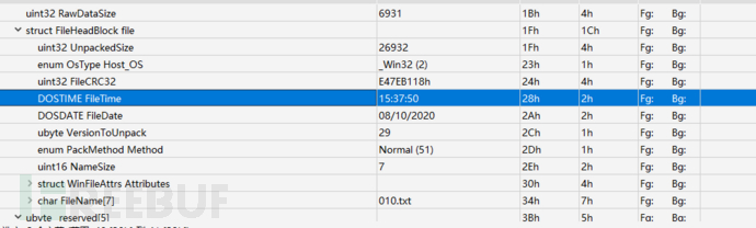 查看4.rar的字段”struct RarBlock block[0]”->”struct FileHeadBlock file”->”DOSDATE FileDate”/”DOSTIME FileTime”