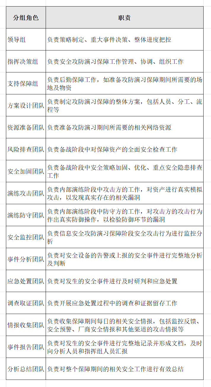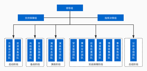 在启动阶段,应着手建立一个分工明确的网络安全攻防演练职能团队,以保证安全自查工作得到充分开展,安全防护能力得到有效验证。因此必须明确安全保障团队的组织架构和职责划分。为做好演练工作,建议以如下方式建立安全保障团队的整体架构: